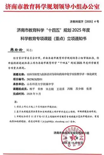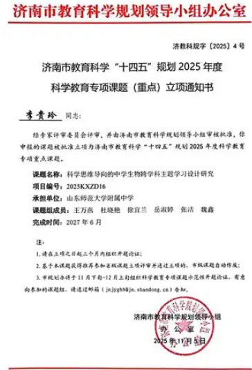 近日,济南市教育科学“十四五”规划2025年度科学教育专项重点课题立项名单公布。经评审,全市共立项50项,山东师大附中报送的两项课题均成功入选。